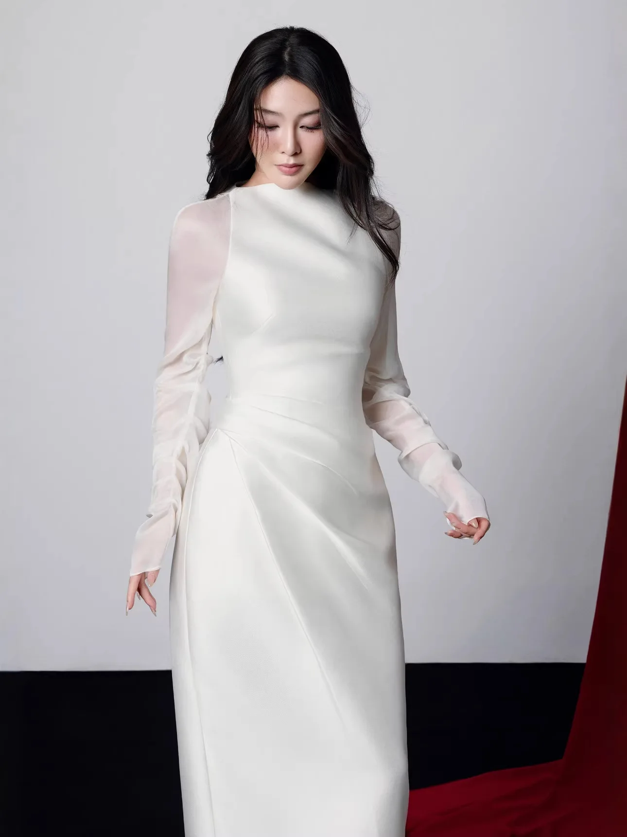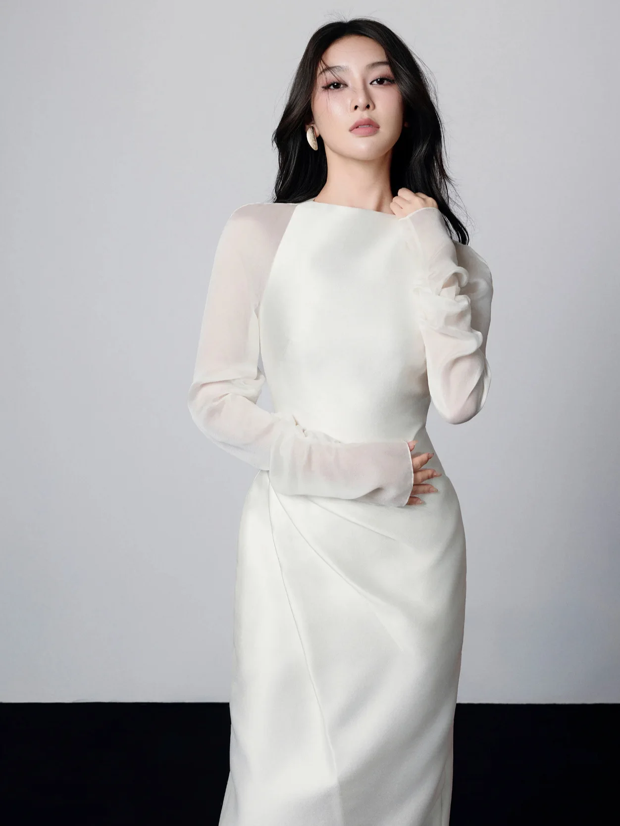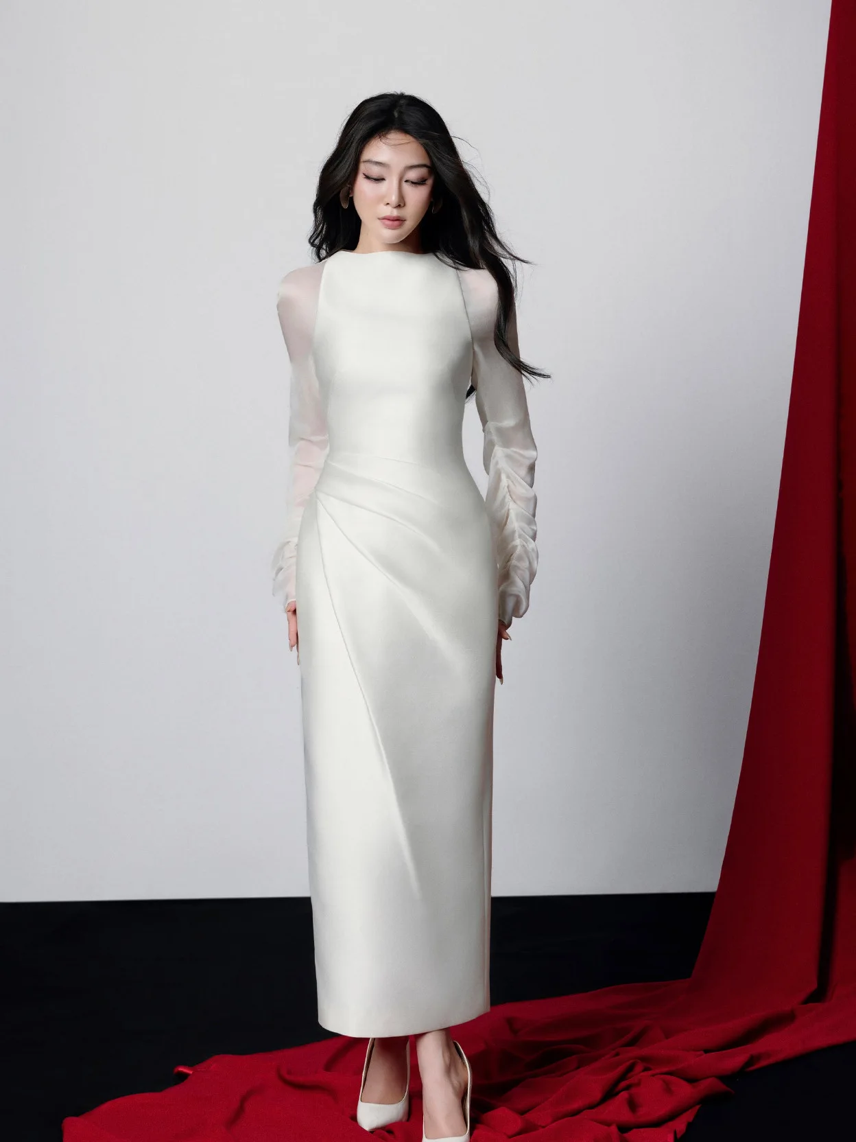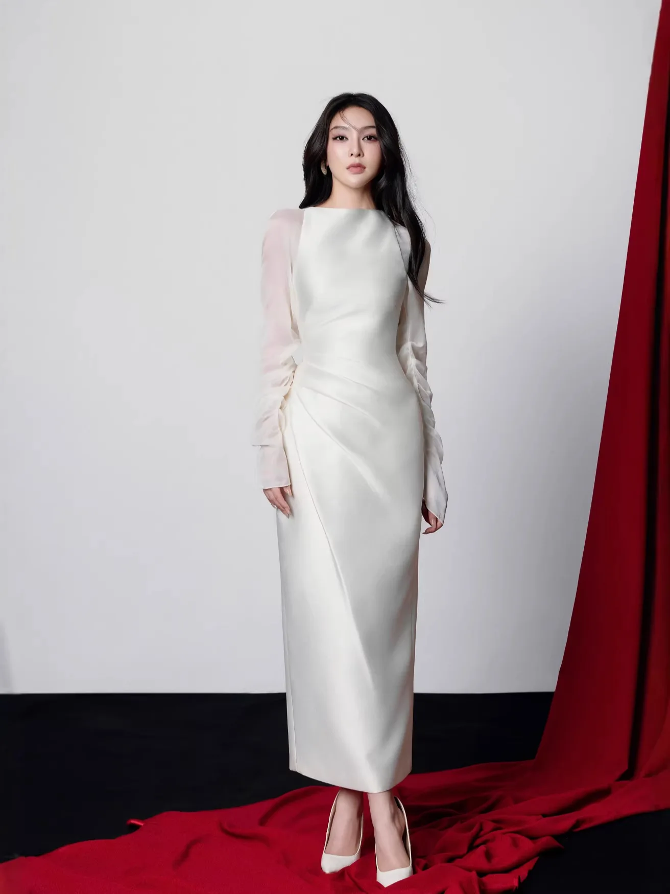 Bettergirl Vietnam Fashion 2026 New Satin White Elegant Long Dress Mesh Patchwork Slim Formal Dress